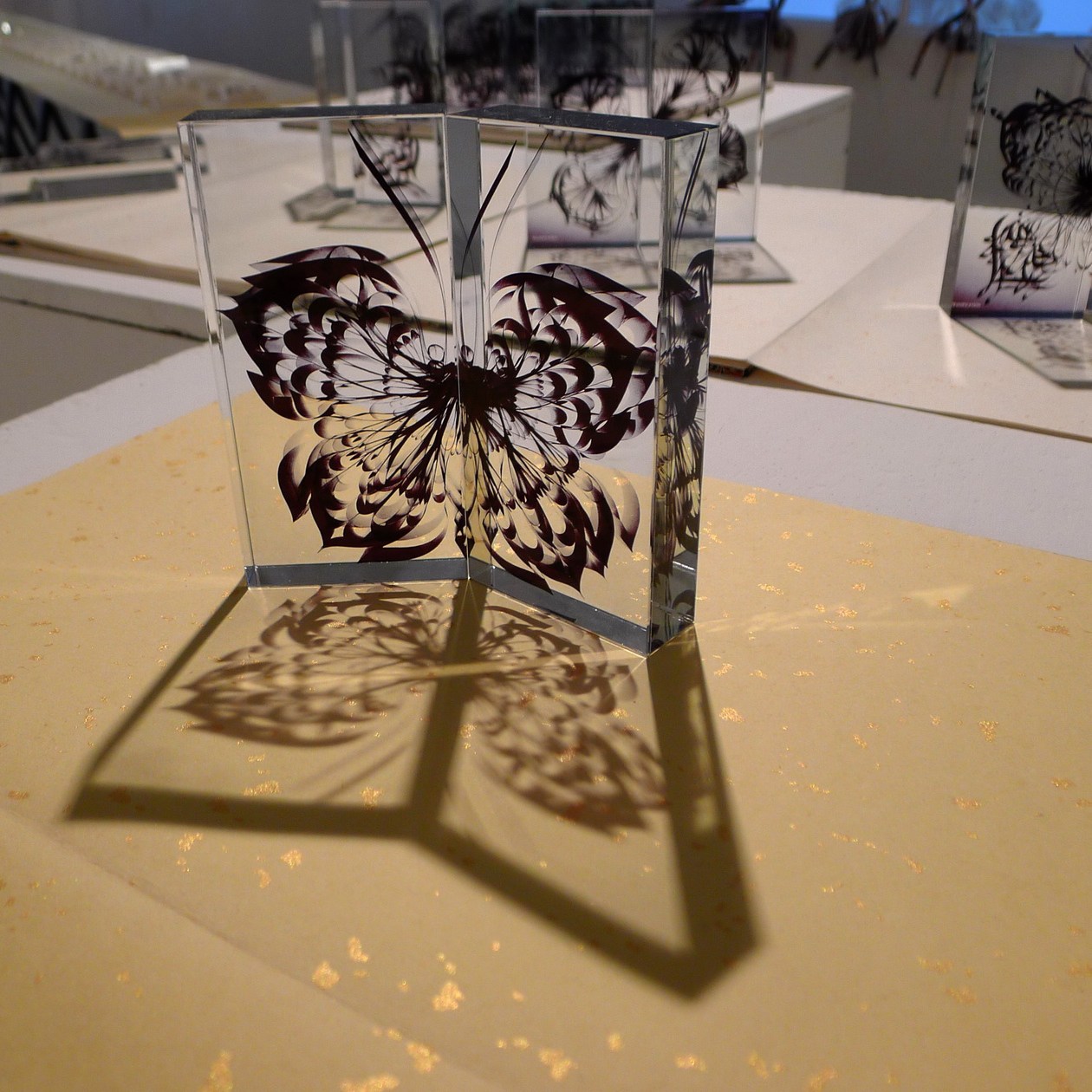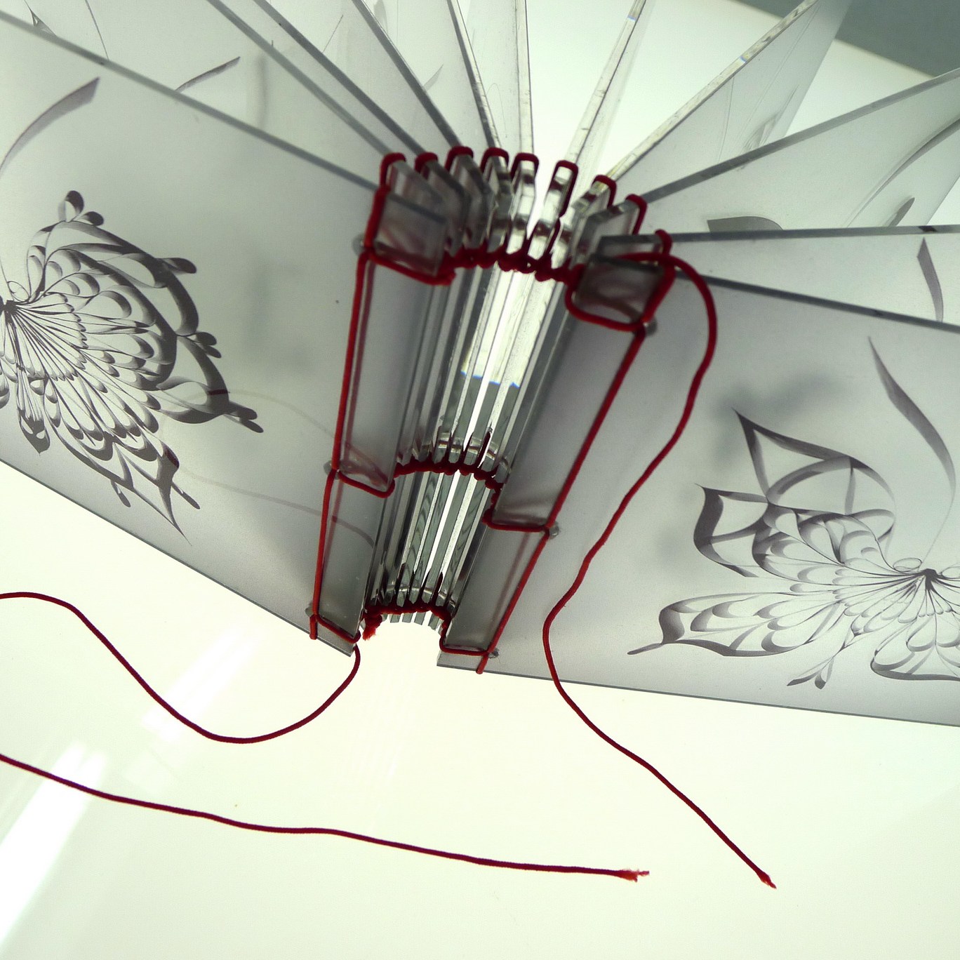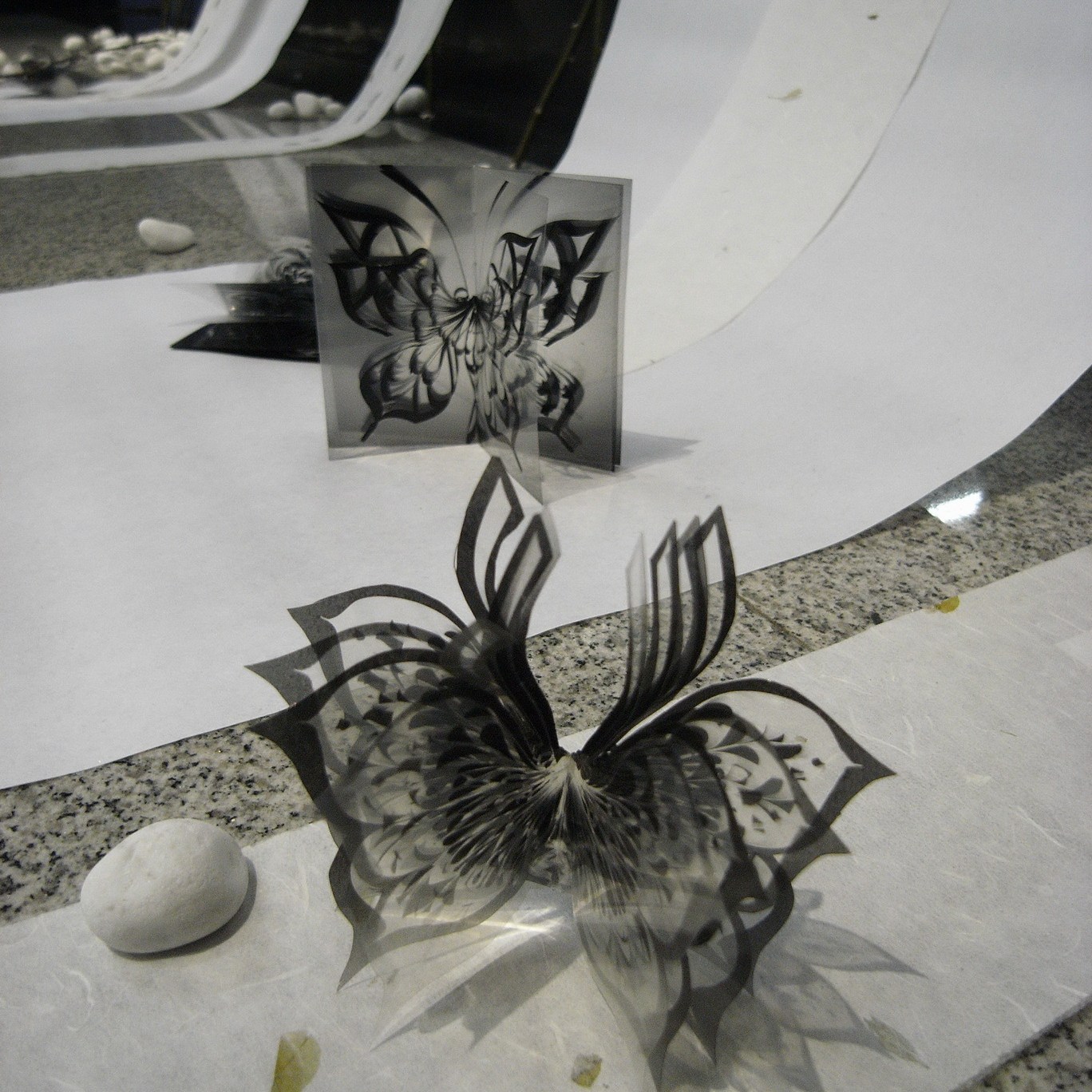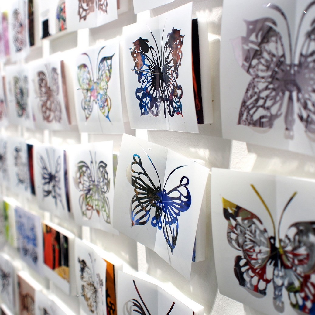 By using the magazine pages as a material, and using the motif of the butterfly – perhaps her intention is to find a poetic language to set the viewer “ free” to a more transcendence and spiritual feeling than the original magazine might have.